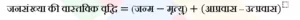 • किसी क्षेत्र में एक विशेष समय के दौरान हुए जनसंख्या परिवर्तन को जनसंख्या वृद्धि कहा जाता है